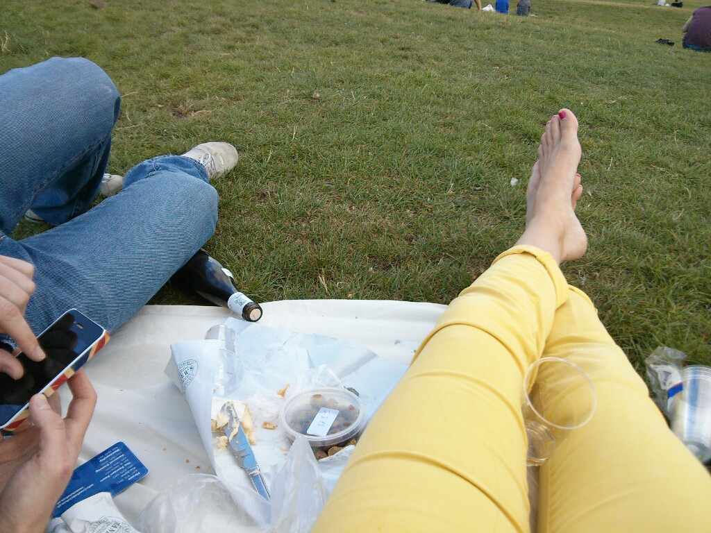 The aftermath of our picnic: olive pits, an empty bottle of French wine, and a bite of smudged Brie.