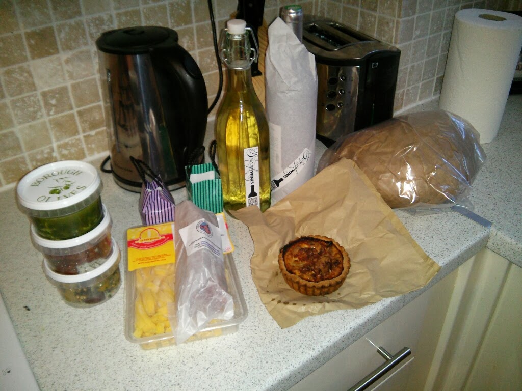 | Our rations after Borough Market. Bread, pasta, olives, quiche, jam, and wine straight from the barrel! I can take that bottle and refill it for only 5 pounds! |