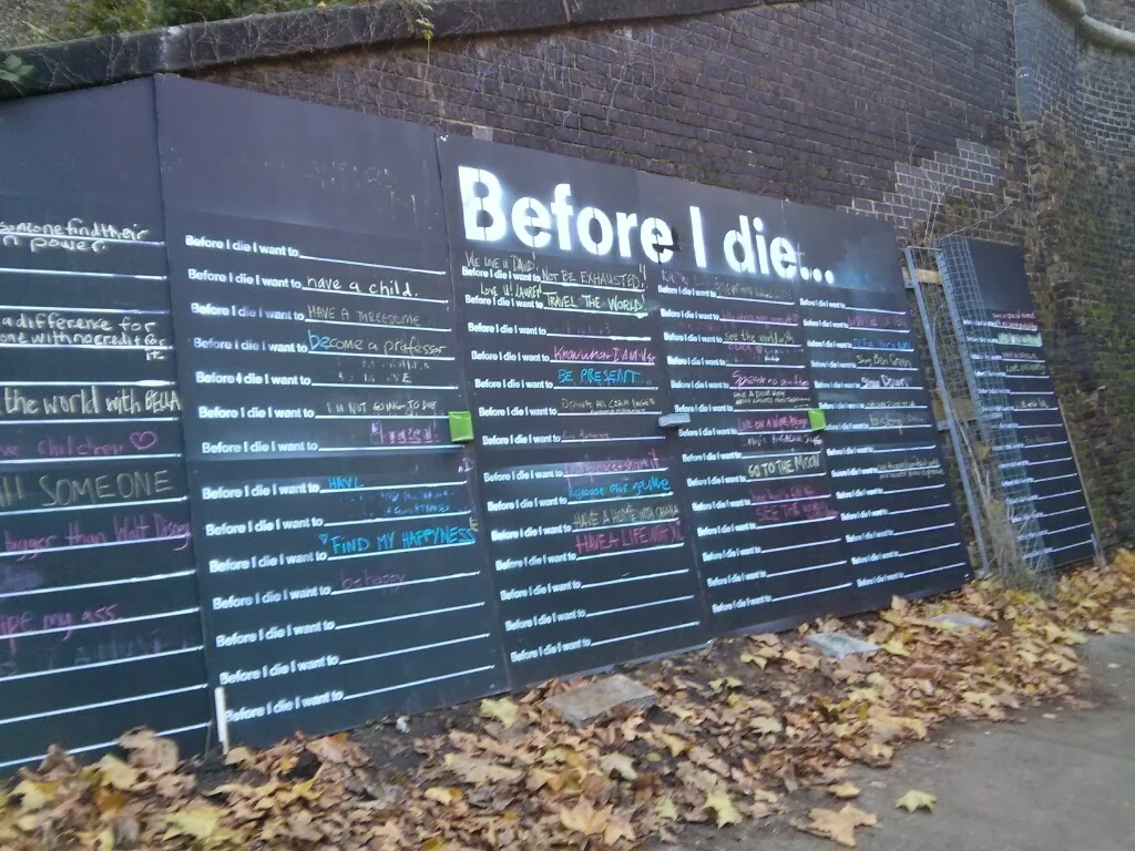 | Street art we found while walking along Regent's Canal. I wrote to live everyday with joy, Mom wrote to live life with no regrets, and Madeline wrote to adopt a British accent. Ha! |