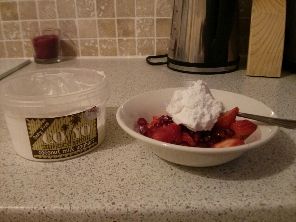 One thing the UK has that I never saw in the US...coconut yogurt. SOOOO good. It is just coconut milk and probiotics. Dairy free and vegan...I believe the ingredients are just coconut cream and probiotics...it is nearly 100% fat, but still only 160 calories for the whole tub (no carbs like regular yogurt, which even if you buy nonflavored, it still has lactose). I eat is like whipped cream, and put it on top of fruit. Today, I had it with fresh pomegranate seeds and strawberries. Yum- I think I'm might go for seconds of this now!