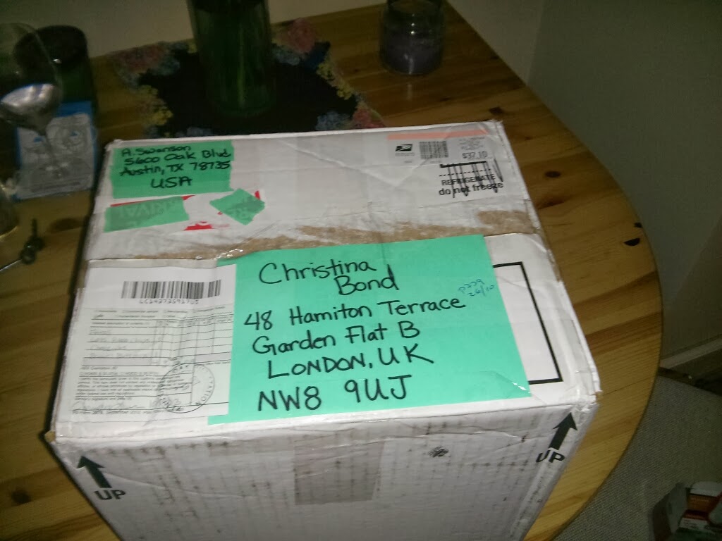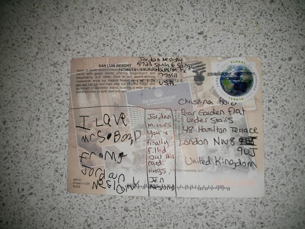 We came home Saturday night to all sorts of treats! First, I saw by our mail box what looked like an advertisement to the San Louis in Galveston and I almost threw it away, without thinking. Then I thought, "Wait...why would a hotel from Galveston be sending propaganda all the way to London?" I turned it around, and saw it was a post card from one of my old students, Jordan! SO sweet and made my day- even adults love getting mail!